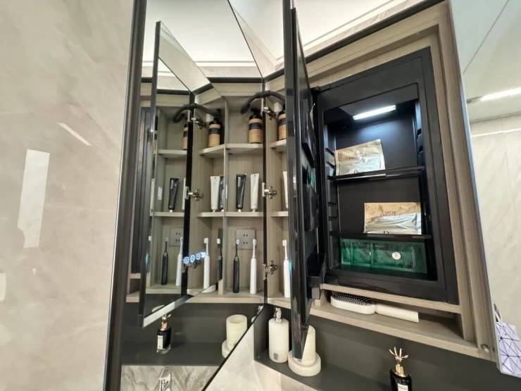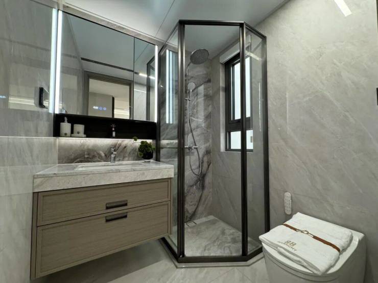 一线品牌:厨房配方太四件套、铂浪高大单槽+末端净水器;主卫用科勒洁具、汉斯格雅恒温花洒、智能魔镜(含美妆冰箱)