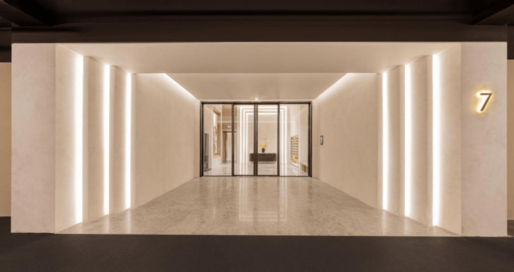 天安1号不是单独打造建筑本身,更是将生活场景与整体环境相融合,细节里都是满满的诚意:社区入口大堂将艺术感融入纯石材营造的界面;已经呈现的玻璃+木色装饰的休憩会客空间,让归家宛若进入艺术领地;