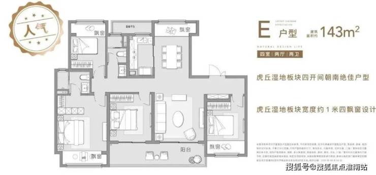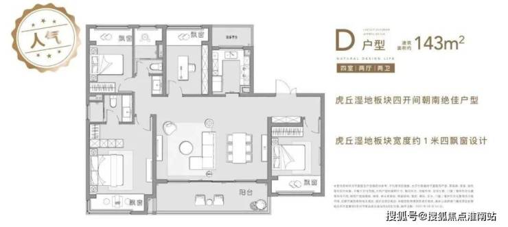 136㎡和143㎡户型分布于8幢小高层,均是四房四开间朝南,大横厅或者双联阳台可选,属于市场上主流的改善产品。值得一提的是,项目赠送的约一米进深大飘窗据说是板块内最宽飘窗。