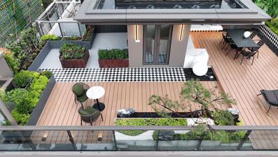 建筑面积约70㎡的赠送露台,后期可以设计成屋顶花园,种上满满的花果蔬菜;也可以铺上地板,摆上沙发和遮阳篷,打造成私人会客空间。