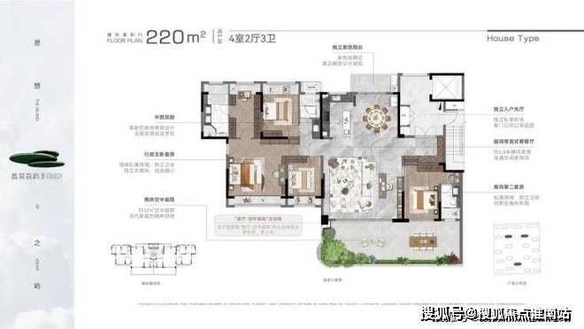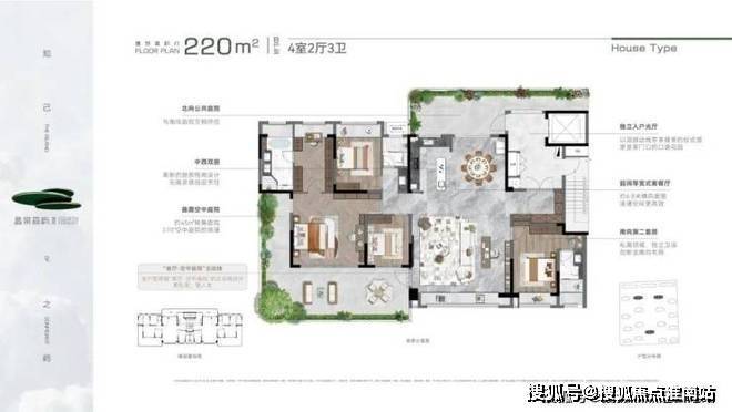 建面约220㎡的「典藏版墅居」堪称空中墅居的终极形态,独门独户+双重归家动线+前庭后院+无界景观+墅级挑高+动静有序+星级主卧。