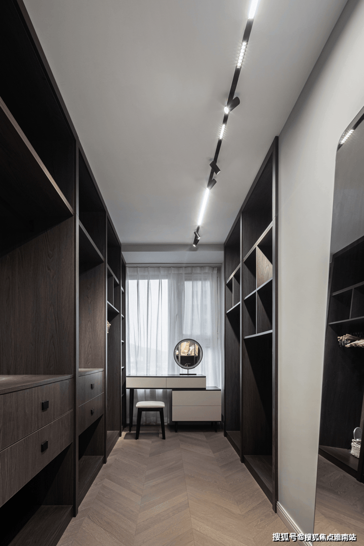 步入式衣帽间选用了开放的柜体,整个柜体布局清晰,两侧呈一字型,悬挂区、叠放区、储物区一应俱全。