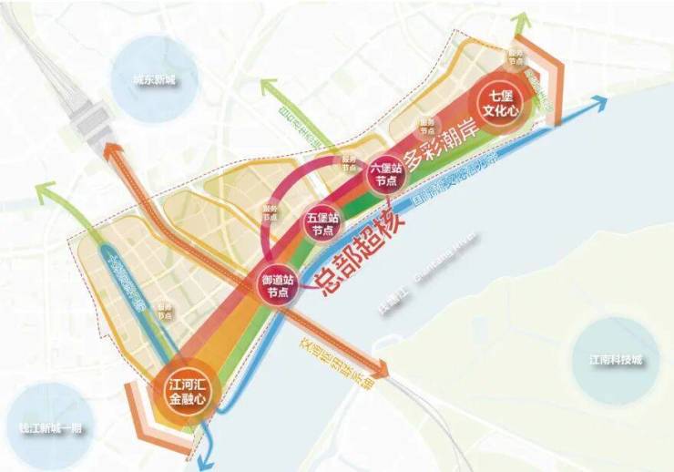 国际滨水秀带:海塘安澜工程|四大站前花园|五座观江潮头驿站|江岸慢行廊道系统,一横四纵的水街商业|海塘文化生态公园