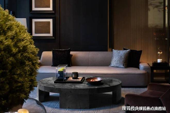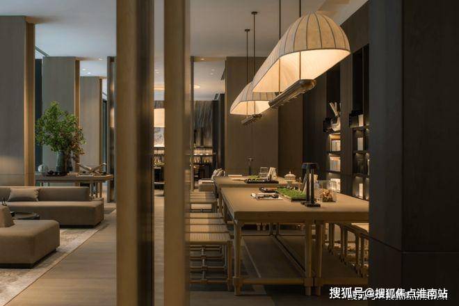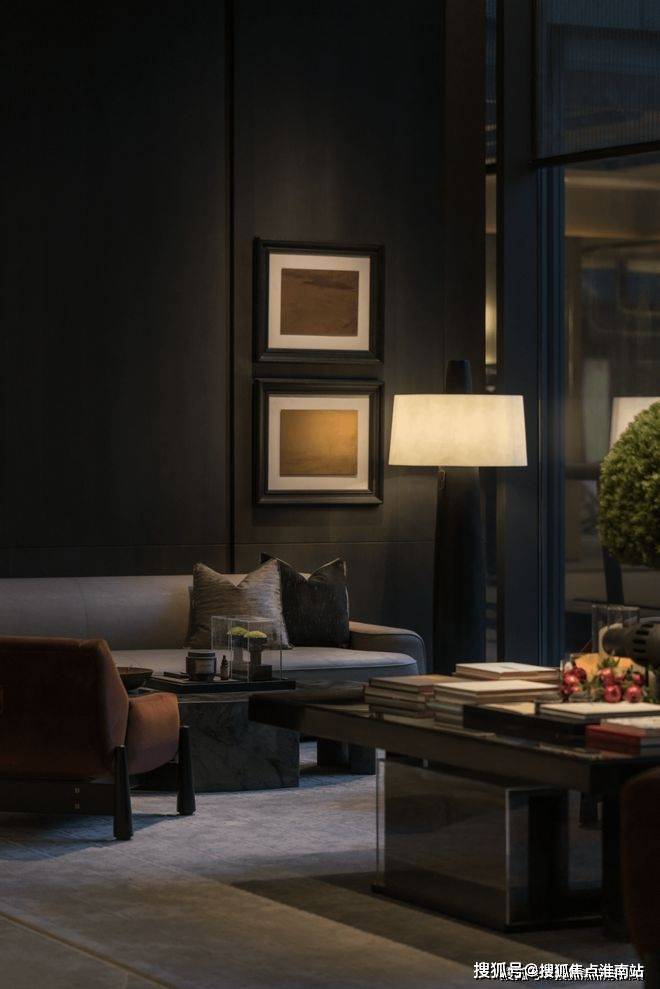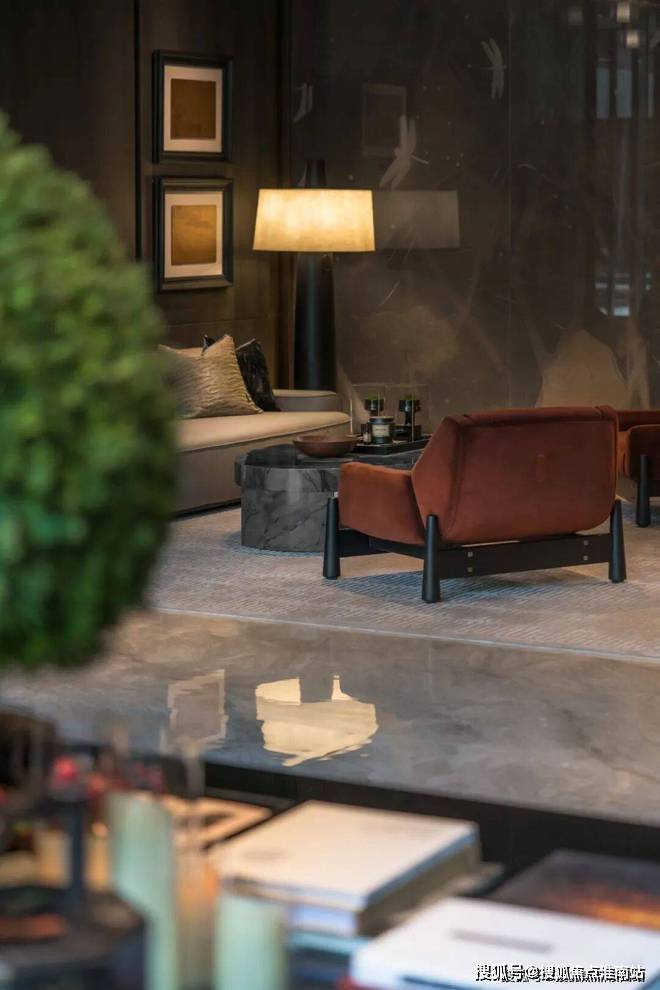 重心下移,人们的视线由此从庞大的空间秩序中游离出来,重新聚焦于身边之物的细部。布艺织品密实的触感,黄铜复古的质地,皮质扶手细腻的光泽,皆以一种流畅的美学语言,将空间视觉形象中的低调品味、矜贵内涵一以贯之。