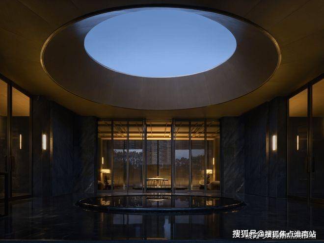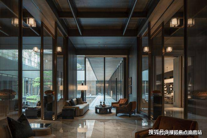 水景居中,四面窗方方正正地切出了一个天井,水、石,树,人们游移其间,在与自然的互动中平静内心、悄然归隐,形成了具有中式院落感“围坐而观景”的私享氛围。