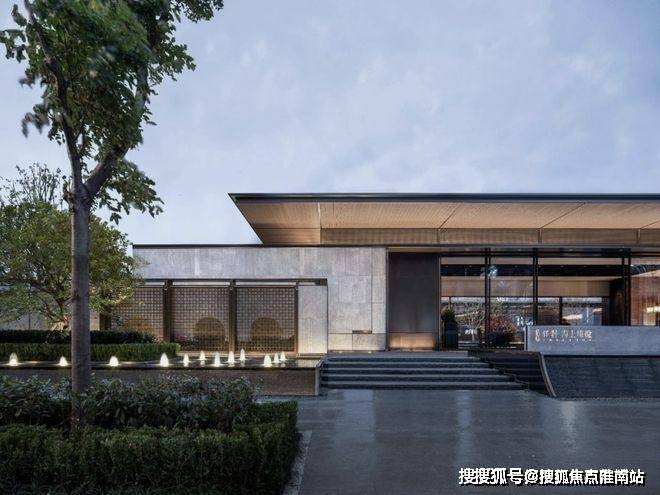 地上入户大堂方面,在造型上运用了中式元素挑檐,搭配香槟金型材金石嵌套设计,显示出一种精致奢华却内敛的感觉。