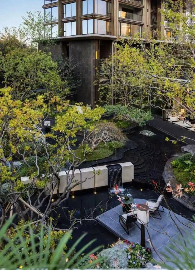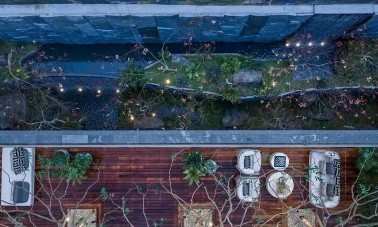 自【悬浮茶室】拾级而上,在【思韵书院】外,一处闲憩放空的【阅川水岸】至此呈现,脚下溪流自脚下蜿蜒而过;眼前,是幻影蓝奢石池底的幽邃微光。一株来自地中海的油橄榄,与一棵百年老桩紫薇在此相望。
