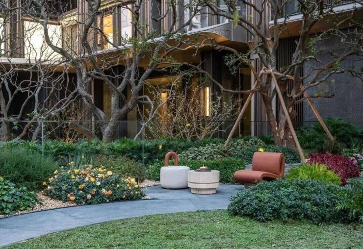 而在3、5号楼之间,则搭建了【围炉夜话】场景空间。古木纹奢石砌成的火炉旁,整木炭化石凳散发着山林野趣,一株红舞姬枫树翩然伴舞。冬日傍晚,好友围坐,体会名门温情。