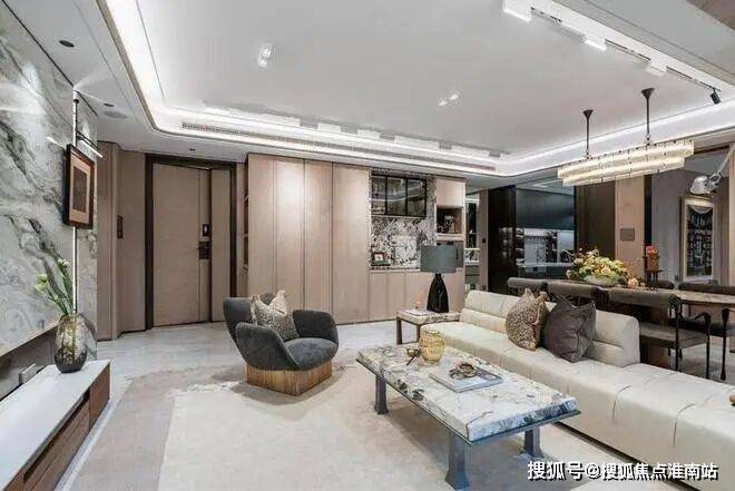 ✔用材考究:室内墙面大量包裹木饰面,温润质感消解冷硬感;137㎡户型地面铺高奢石材,搭配石材打造的弧形餐边柜,厚重质感凸显空间高级感;