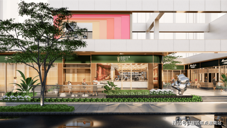 在空间上,项目让出城市街角空间形成街角绿化社区名片,约75米超长尺度城市街区生活形象,打造城市温情归家界面。同时利用项目自持的约500㎡商业配套,为业主提供家门口的休闲与便捷,也能触发更多的社交可能。
