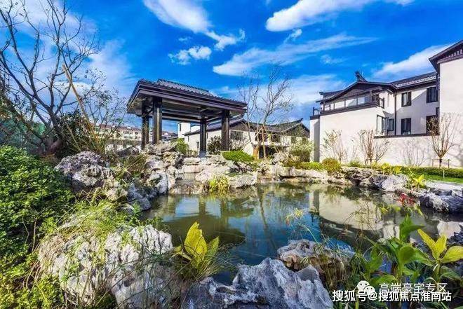 白墙黑瓦的视觉风格,中轴对称的大气格局,高地错落建筑造型,辅以亭台、叠水、乔木等中式景观布局,营造浓厚的中式宅院体验感。