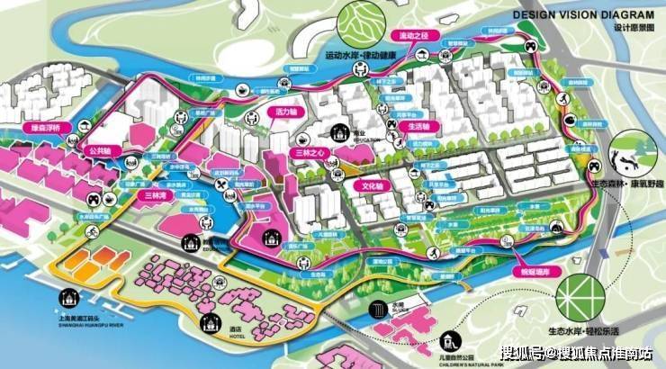 生态环境方面:融合上海2035规划,公园城市、森林城市、湿地城市空间生态基础,三林滨江,以一廊两心三园四片区,规划三林滨江的独特的城市生态营造。