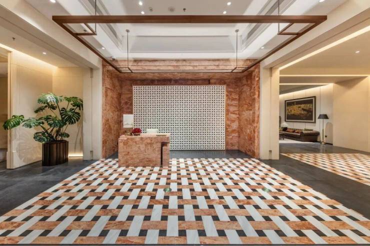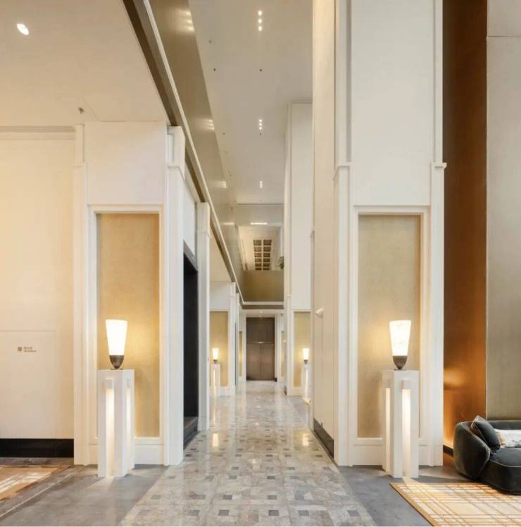 入口约99米超尺度宏阔气象,取海派艺术大师吴湖帆《晓云碧嶂》中云岫初开的晨曦图,通过渐变晕染的山水长卷演绎青峰山林的诗意场景。奢石、名树点染其中,勾勒尊崇归家序幕。