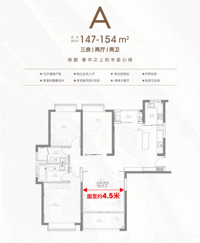 2、超尺度空间,居住体验拉满:对比市面上150㎡左右四房,客厅面宽普遍仅4米,主卧开间约3.6米,北向房间甚至只能作书房使用。