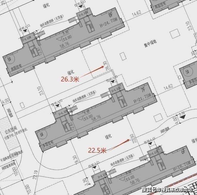 3、洋房部分楼间距超1:1。以8#为例,和6#之间有26.3米的距离,而8#这栋楼高24.75米,这个楼间距甚至是超过了1:1的,6#和2#的楼间距也是如此。这在纯洋房小区中也是比较少见的。
