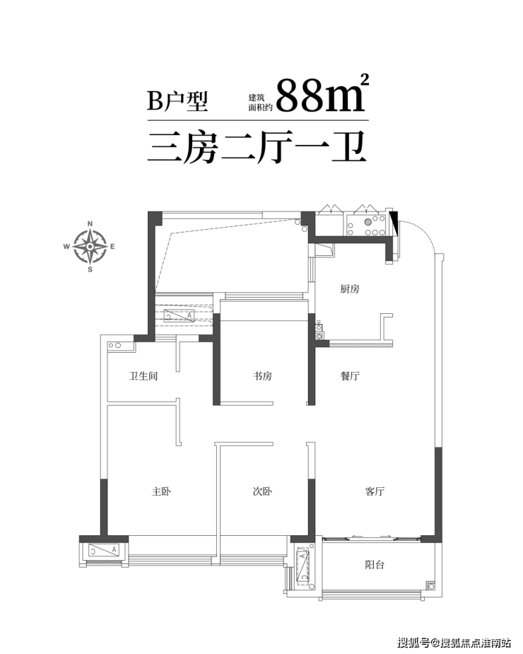 建筑面积约88㎡精雅三房一卫,三口之家理想