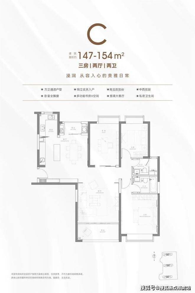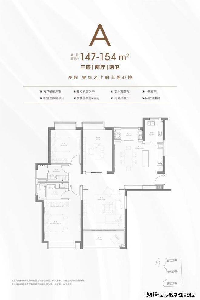 建面约147-154㎡三房两厅两卫:中西双厨+岛台设计,满足不同家庭的烹饪偏好;客厅面宽约4.5米+南北双阳台,奢阔尺度提升居住舒适度;主卧套房设计面宽约4米,三卧全飘窗极尽享受灵动空间。