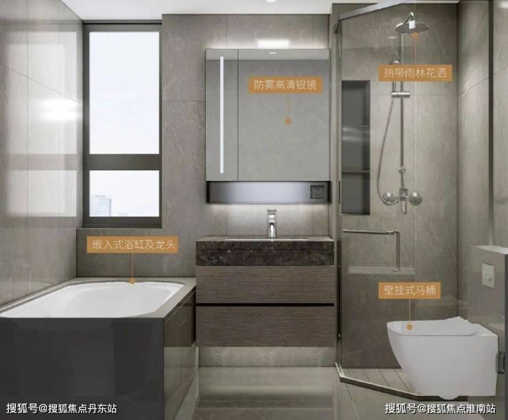 门槛倒斜边,防止日常碰撞;防雾高清银镜、美颜镜前灯、柜下照明灯带,让空间更明亮,提升使用体验;淋雨中岛防滑地面、热带雨林花洒、嵌入式浴缸及龙头,让洗浴更舒适、安心;除菌电热毛巾架,升温杀菌,更好呵护家人健康;壁挂式马桶、卫洗丽,实用美观又方便清洁。
