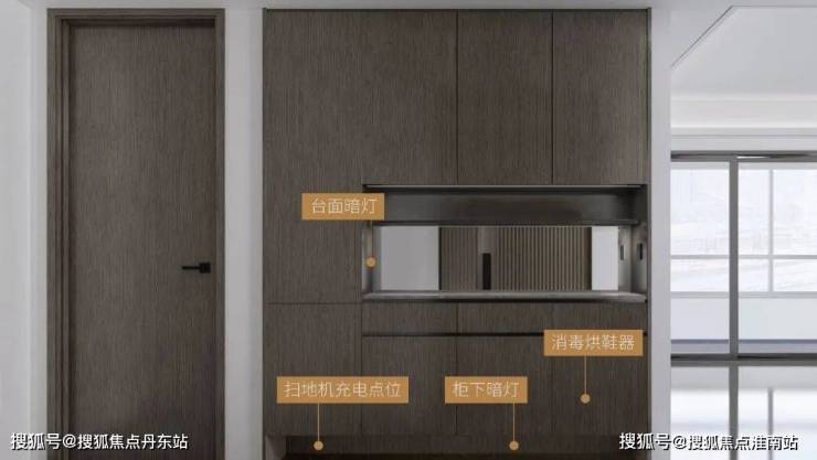 台面暗灯、柜下暗灯、入户感应、一键断电、消毒烘鞋器、扫地机充电点位6大设计,让居者出行更方便。