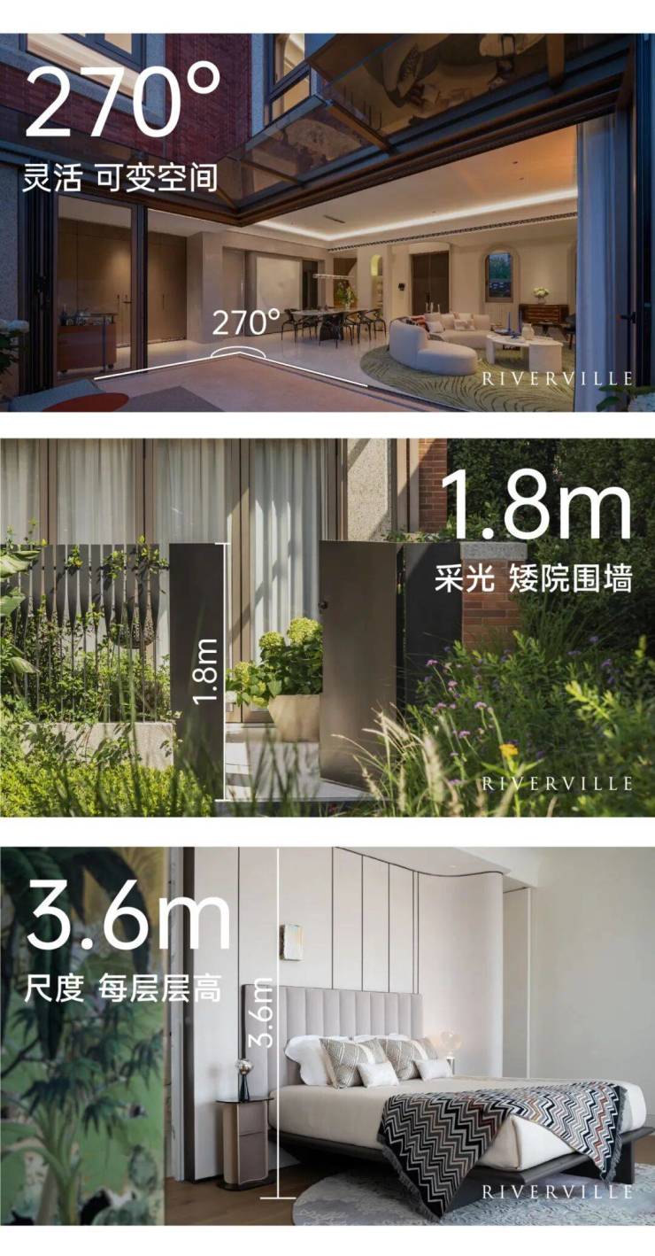 「开阔尺度」:约3.6米层高、大窗墙比等花园里弄的尺度突破,尽显居者风度。