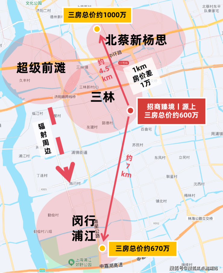而招商臻境单价则依旧处于性价比十足的“6”字头,建筑面积约95㎡三房总价仅约600级,相比之下,北面直线距离约4.5km的北蔡新杨思,板块在售新房单价陆续超10万+/㎡,想买三房预算需破千万,每隔1km房价就几乎相差1万。