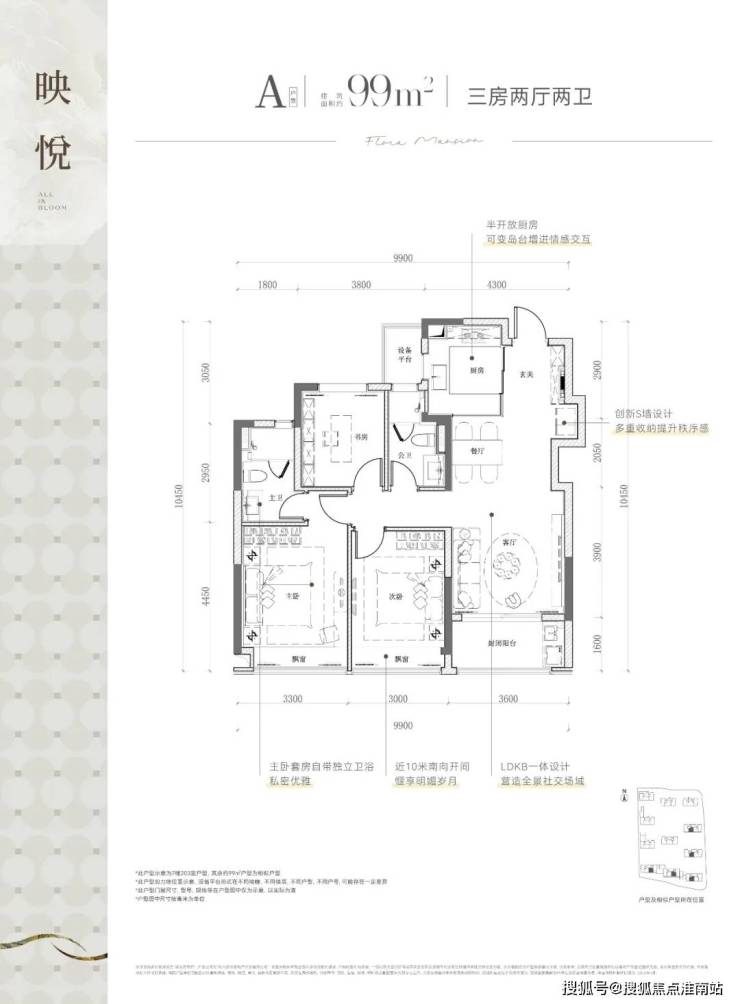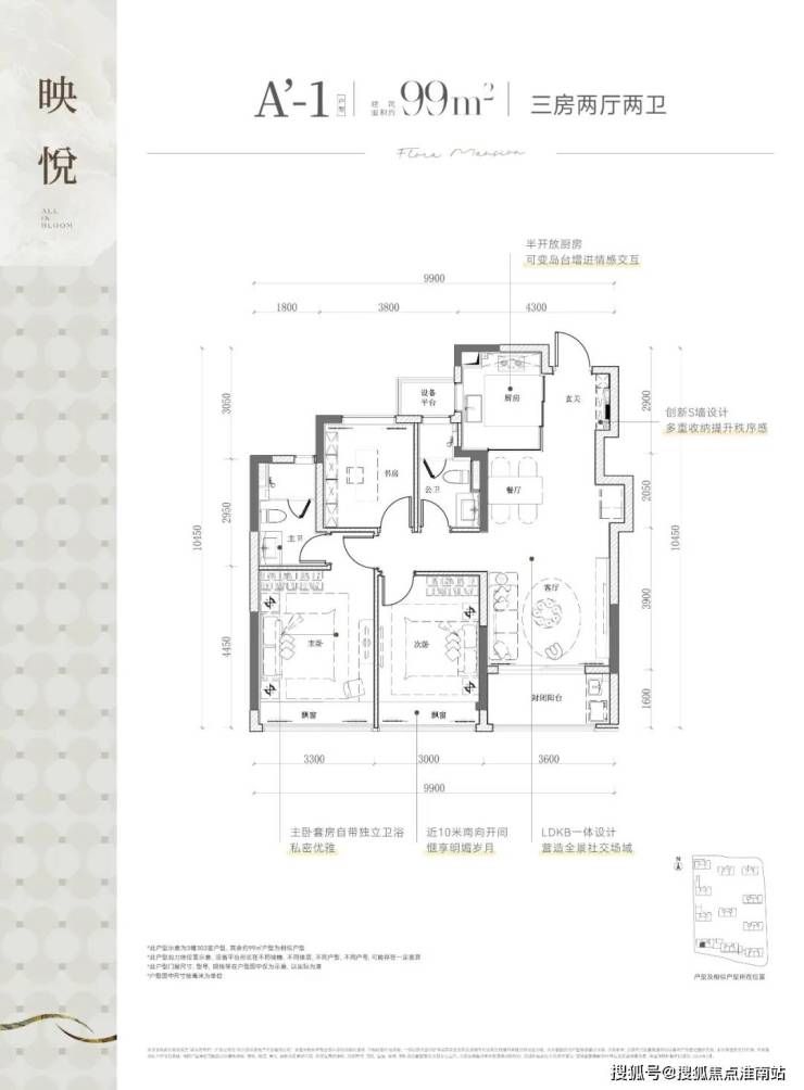 该边套户型,不仅有270度的采光视野,主/次/客卧三大开间并立朝南,“含阳光量”十足。