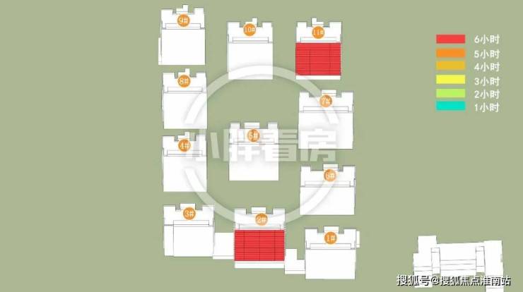 冬季:2#采光优异几乎不存在遮挡。11#低层受遮挡。就具体遮挡时间而言,11#除早晨和傍晚外其余时间段均受遮挡。