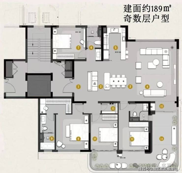 还有一款建面约189㎡户型,分奇偶层,做到了动静分区,客厅270观景、中西厨岛台、双次卧套房、客厅双层挑空、超10米客餐空间、中花园露台等等。