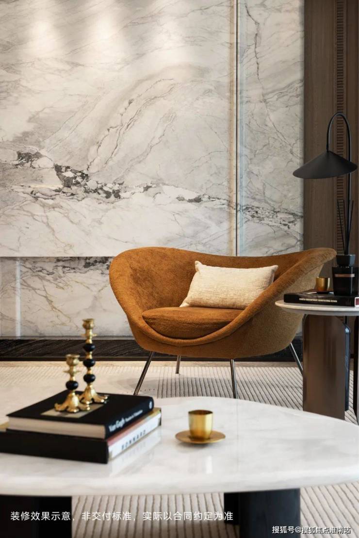 客厅背景墙的“烟雨江南”天然大理石,不同于传统平面背景墙,通过弧度及立体的造型处理,并镶嵌不锈钢材质,对于金茂而言,比奢石昂贵的,是让奢石真正与空间气场融为一体。
