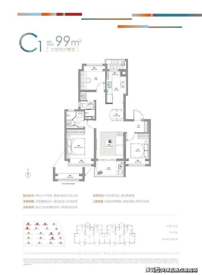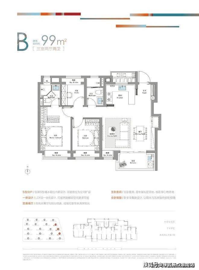 建面约99㎡三房:该户型是典型的飞机格局,很大程度上提高了使用率