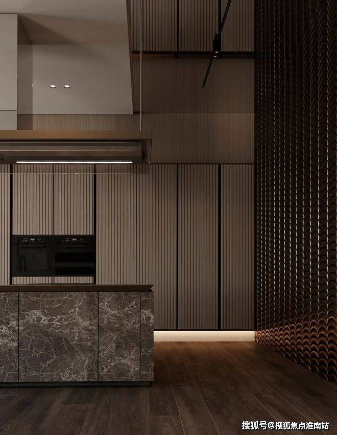整个餐厅的墙壁和天花板全部使用可视镜作为装饰,把客厅和餐厅的风景全部融合在一起,餐厅的餐桌和大理石岛台完全烘托出现代的氛围感。