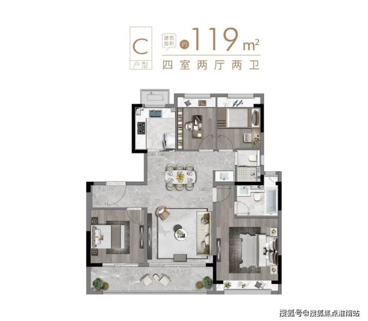 得益于洋房的布局,项目才能在110+的面积段内做到四房。