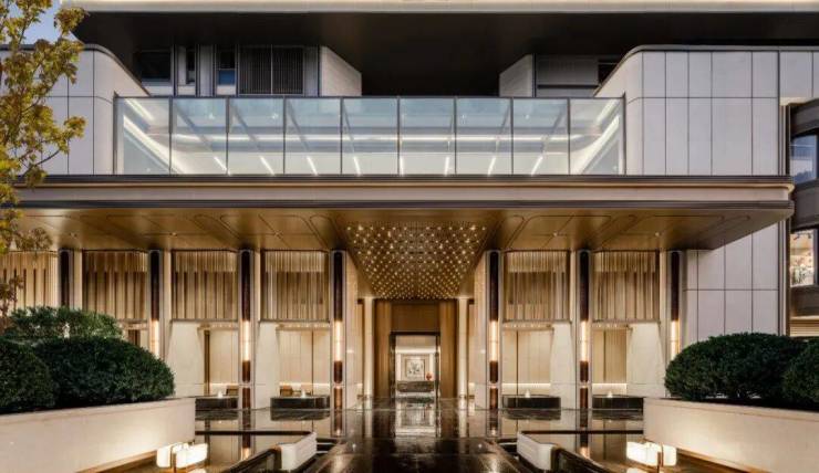 以社区北侧主入口的「鎏金」序厅为例,其设计便足以窥见公区的品质匠心:序厅总挑高约6米、总展面达30米,开阔尺度尽显气派;北向一字排开的8根华之柱,采用古铜色复古肌理双曲面铝板打造,搭配奢石材质,更以毫米级钻石切割工艺为石材勾勒出多层次立体镶边,精致感拉满。