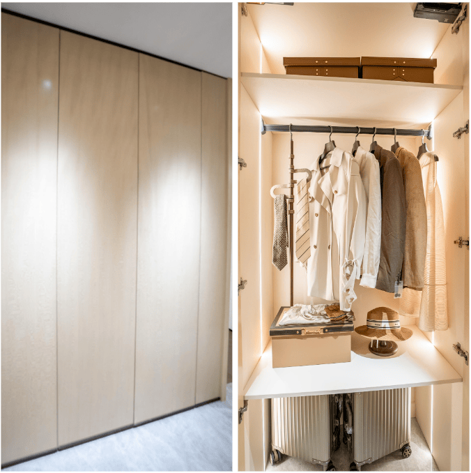 日常随手取用的小物件、女主人的高筒靴,吸尘器、扫地机器人乃至行李箱等大件物品,均有专属收纳空间。更贴心的是,冰箱、洗烘套装等家电也被巧妙嵌入柜体,实现“隐藏式收纳”,让整个柜体外观更显整洁统一,与空间风格融为一体。