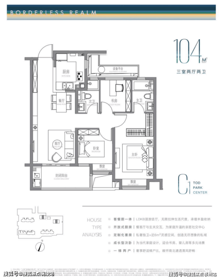建面约104m²户型特点: LDKB洄游式竖厅+开放式厨房,生活尺度无限拉伸,主卧近6m²灵感空间,承载更多功能可能,成长型的次卧,书房儿童房随心所欲。