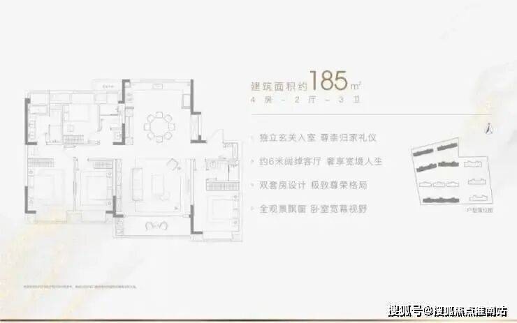 建面约185㎡户型:4室2厅3卫配置,增加一个多功能房间,可作为书房或儿童房,主卧空间更为宽敞,配备双台盆主卫和独立浴缸,客厅面宽达6米,采光极佳