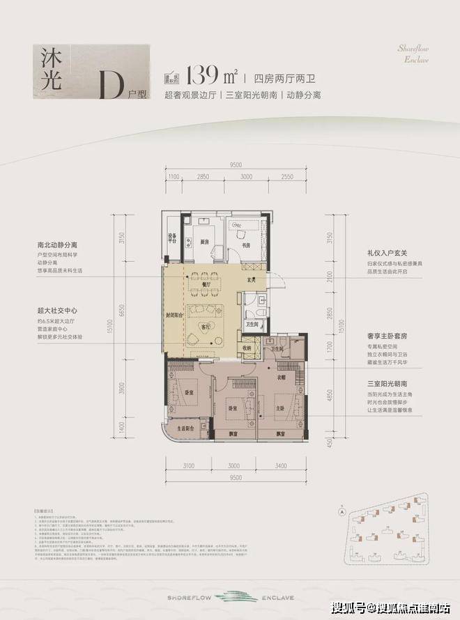 这款户型堪称四开间朝南的“流量王者”,南向面宽约13米,双联阳台+双飘窗设计,视野和采光优秀;套房主卧、双阳光次卧,颇有大平层的气势。