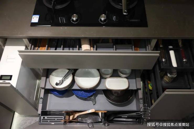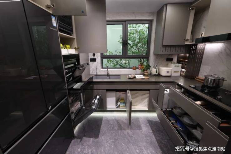 项目的 厨房部分巧妙的利用了 飘窗台做水槽的设计,一方面这提升了 厨房实际使用空间,能将6件套家电塞下,同时保证橱柜配置满足功能。另外一方面这也让 视觉空间上显得更大,更阔绰。