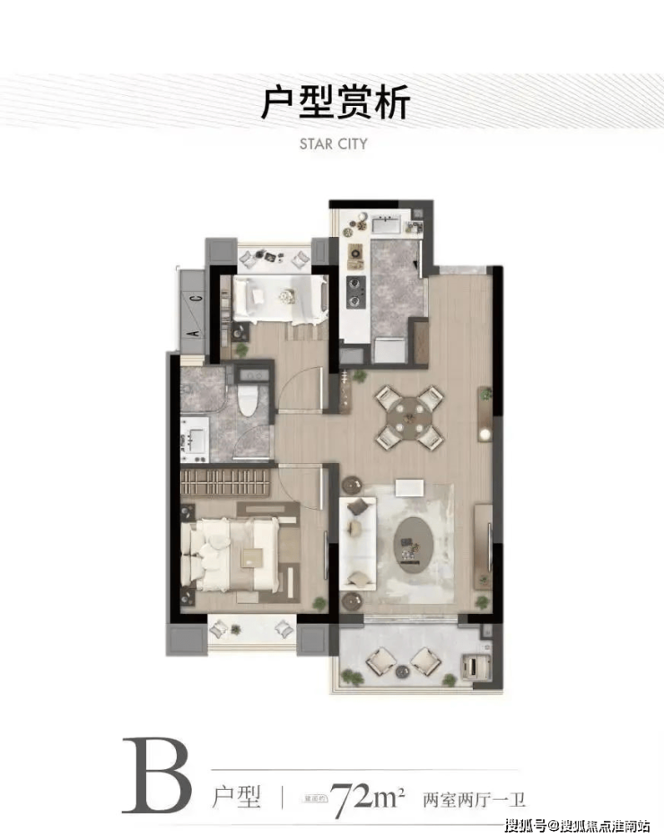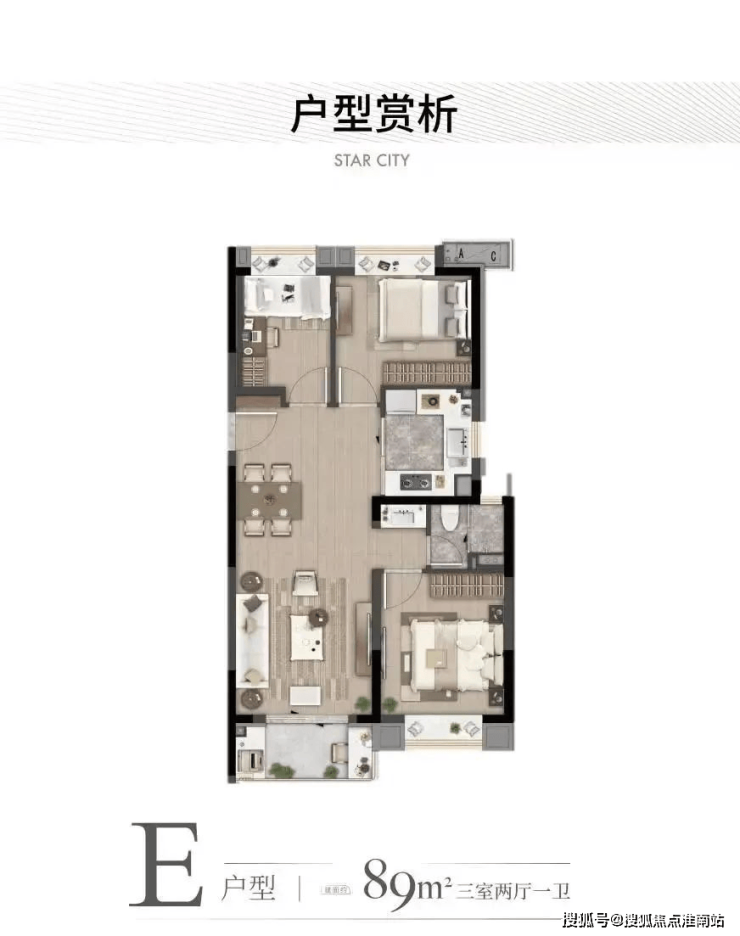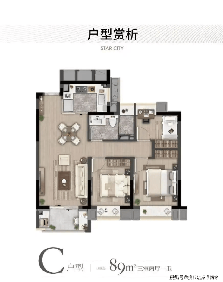 建面约89㎡的户型在俊灿星城竟然做成了3房的产品!尤其是C户型!还做到了三开间朝南!动静分离!不得不感慨下俊灿星城的户型设计真的是从居住的角度出发了!