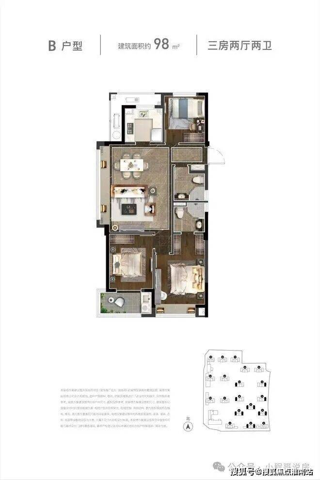 滨旭府总建面约23.5万㎡,由9幢高层(27层)+8幢小高层(18层)+1幢公租房(19号楼)+1幢自持(1号楼)及一所幼儿园组成。小高层主力户型为约89㎡中间套,约98㎡边套,有少量约110㎡边套;高层主力户型为约96㎡中间套,约99㎡边套