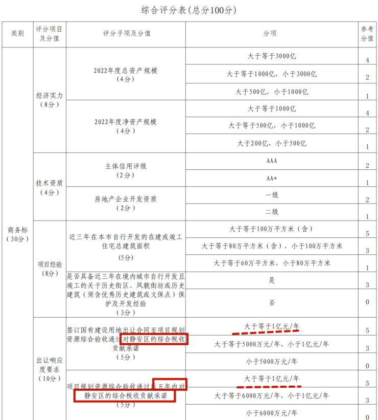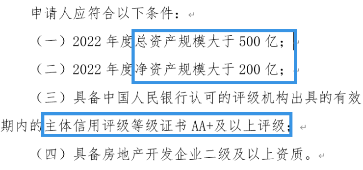 在意向方遴选条件上,除了常规的对企业的总资产规模、净资产规模、主体信用,房地产开发资质等做了要求之外: