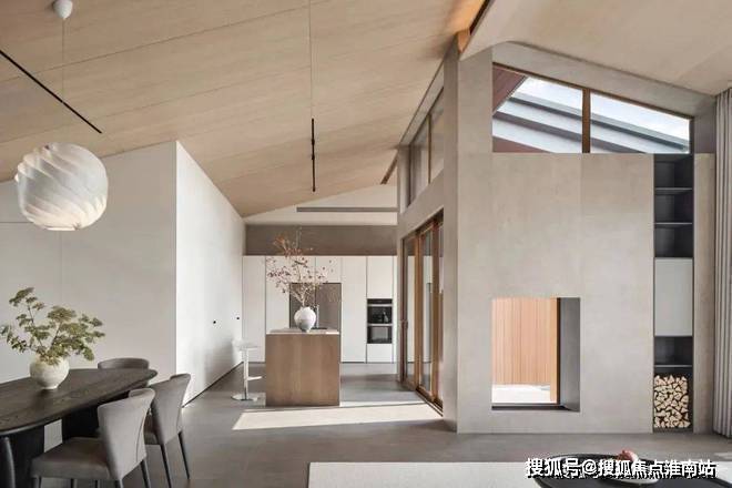 倾斜的吊顶和特意做出的错落 “断层”,增强了空间的纵深感。这种感觉不是来自单一方向,而是四面八方的张力共同形成的。