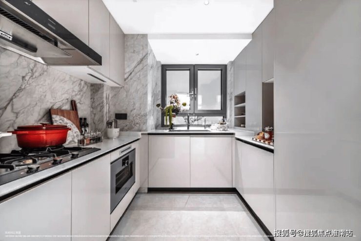 在更见精装功力的厨房和卫浴空间部分,「誉静安」是这样表达的:厨房直接搭载家电界顶流嘉格纳五件套(烟机、灶具、洗碗机、蒸烤箱、双嵌冰箱)—— 要知道同类 143㎡户型多仅配四件套,且鲜少触及该品牌核心产品线;配置欧普凉霸构建体感舒适的烹饪环境,更暗藏针对上海气候的实用设计:定制拉篮实现厨具分层收纳,取放效率更高,水槽柜底板采用 PET 金属膜防潮工艺,黄梅季也不用担心柜体受潮;以及3M 末端净水系统,从烹饪工具到饮水安全实现全维度升级。