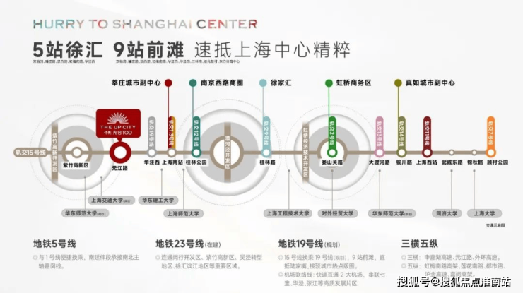 地铁:15 号线元江路站(上盖),5 号线颛桥站约 2 公里,15 号线 2 站至紫竹高新区,9 站达前滩。