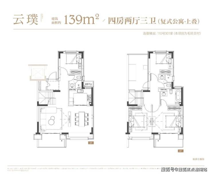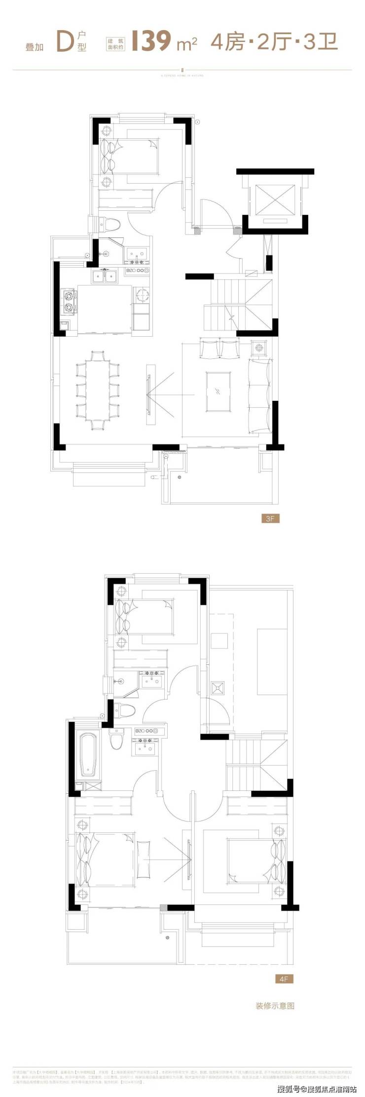 4层叠墅分为上/下叠,上叠建筑面积约139㎡,下叠建筑面积约142㎡,均为4房设计。