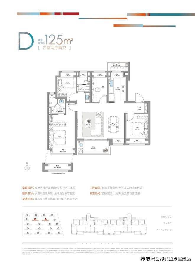 建面约123㎡的四房户型,拥有超大尺度横厅连通阳台,四开间朝南+主卧大套房,给予业主不输千万豪宅的居住体验!