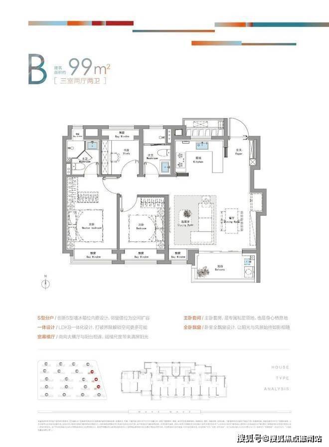 建面约99㎡的边套户型采用大横厅的设计,3+1开间朝南的设计,让这个户型的南向采光面以及尺度感变得十分惊人。