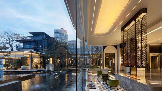 穿过华贵门廊,一境登门庭入府,超阔的接待前场是贝母形大理石地面铺贴纹路,头顶是透光云石弧形穹顶,正前方是皇室杈木影壁,接待台背部静置着“蓝翡翠”奢石背景屏风,以及与下沉水院一体的“三生石”造景,处处流露着优雅的艺术场域。