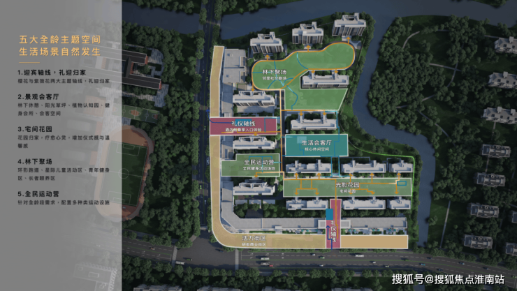 社区空间方面,还打造了两轴一厅一场一营一园林的五大全龄主题空间,将自然景观和城市生活完美的融于一园。