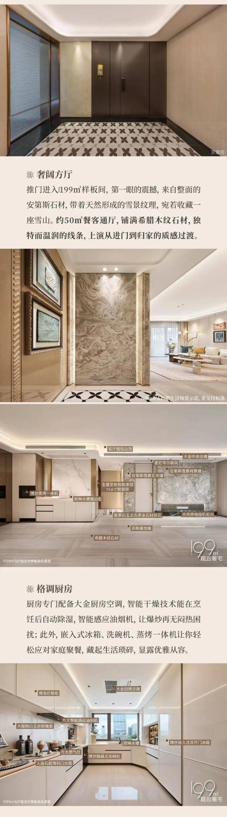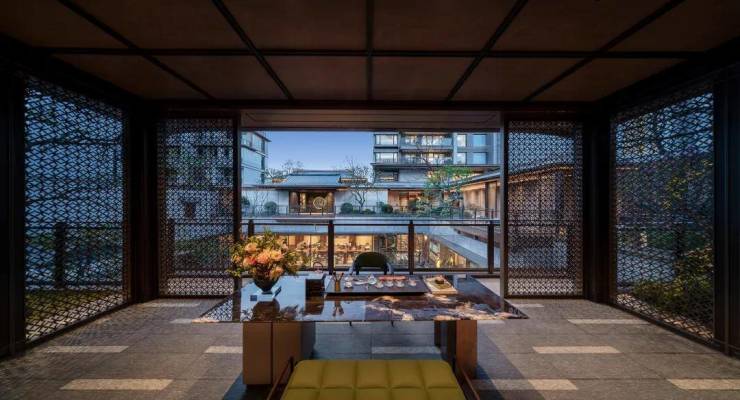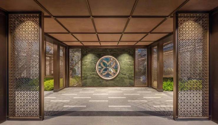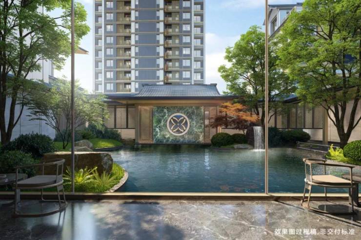 采用“王府中式”设计,大门为歇山顶形制(宽53米、高近11米),配黄铜狮、罗汉松及蓝翡翠奢石。园林融入西湖十景元素,如“花港观鱼”水景、“柳浪闻莺”绿植,并设雾森系统首层单元门厅石材铺就,肌理沉稳。